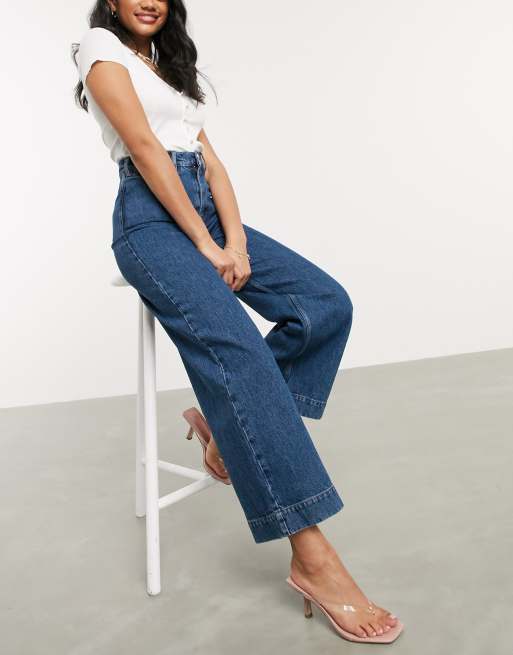 ASOS DESIGN high rise 'easy' wide leg jeans in midwash blue | ASOS