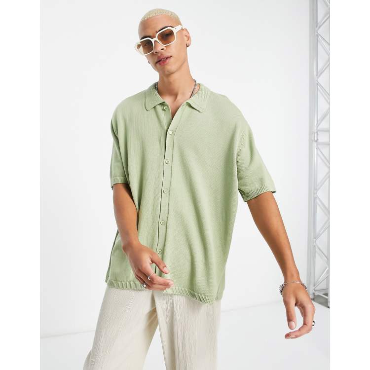 ASOS DESIGN oversized knitted button through polo in washed green | ASOS