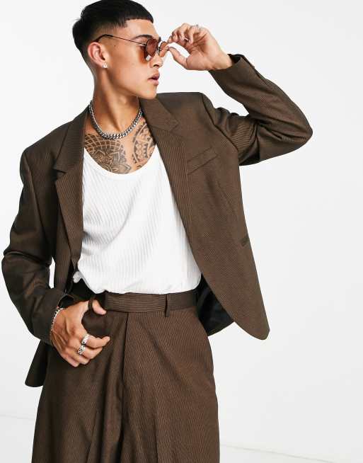 ASOS DESIGN slim longline suit jacket and extreme wide suit trouser in brown tex | ASOS