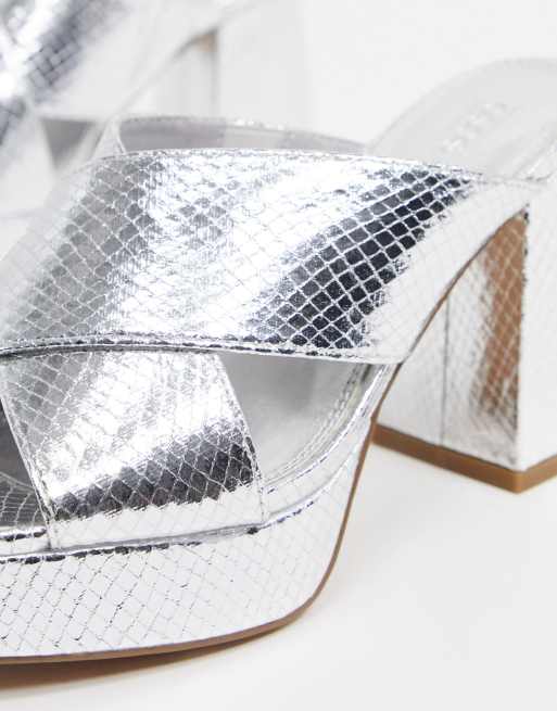 ASOS DESIGN Harmonize mid heeled platform mules in silver | ASOS
