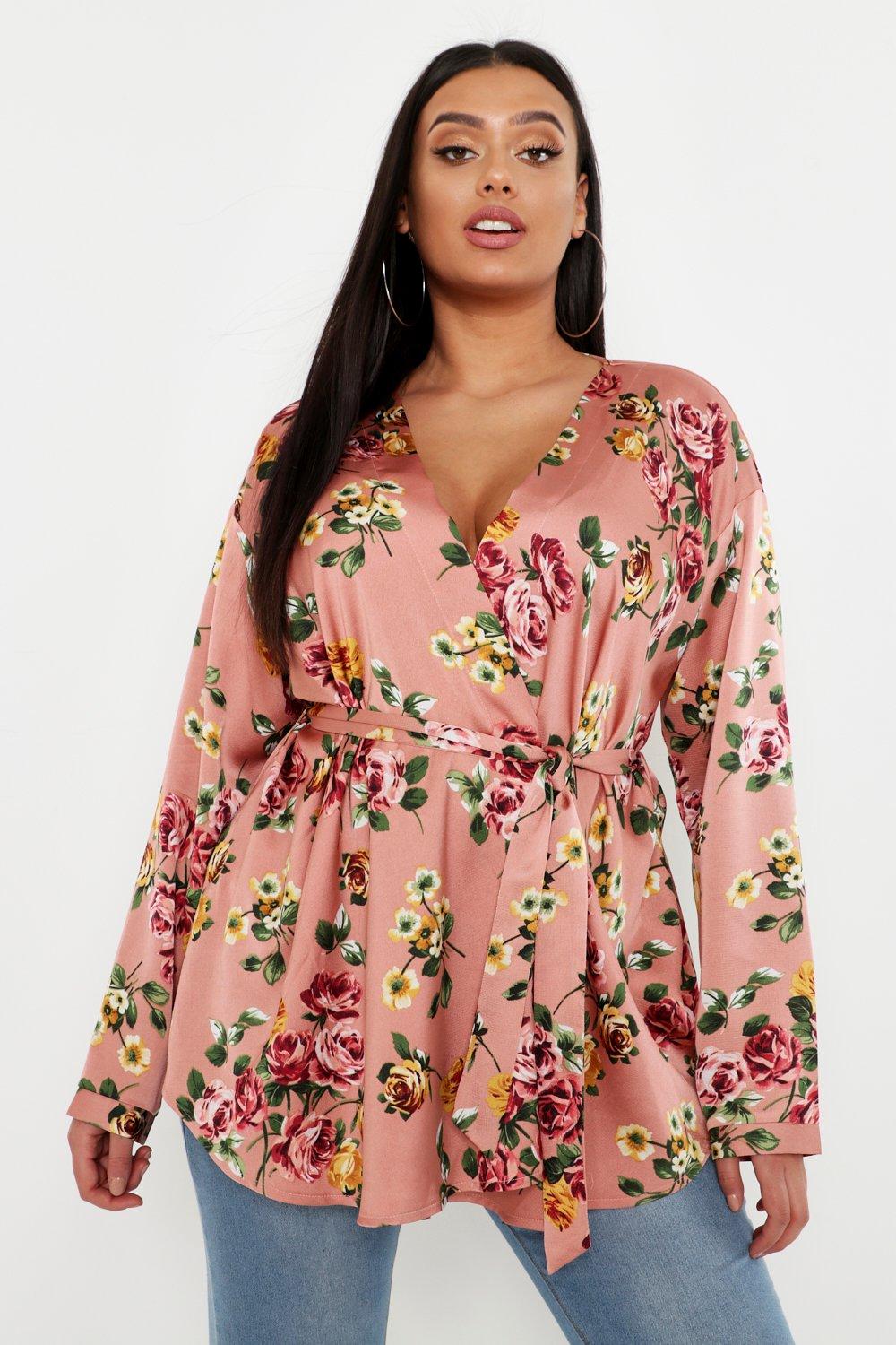 boohoo Plus Floral Print Satin Wrap Top - Pink - Size 16 - Black Friday