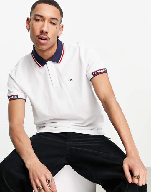 Tommy Jeans rib jaquard collar and cuff logo pique polo in white | ASOS
