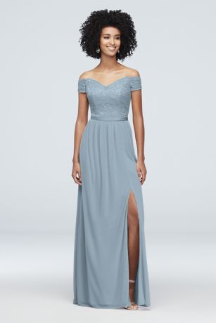Extra Length Lace and Mesh Off-The-Shoulder Bridesmaid Dress - Ice Blue, 2